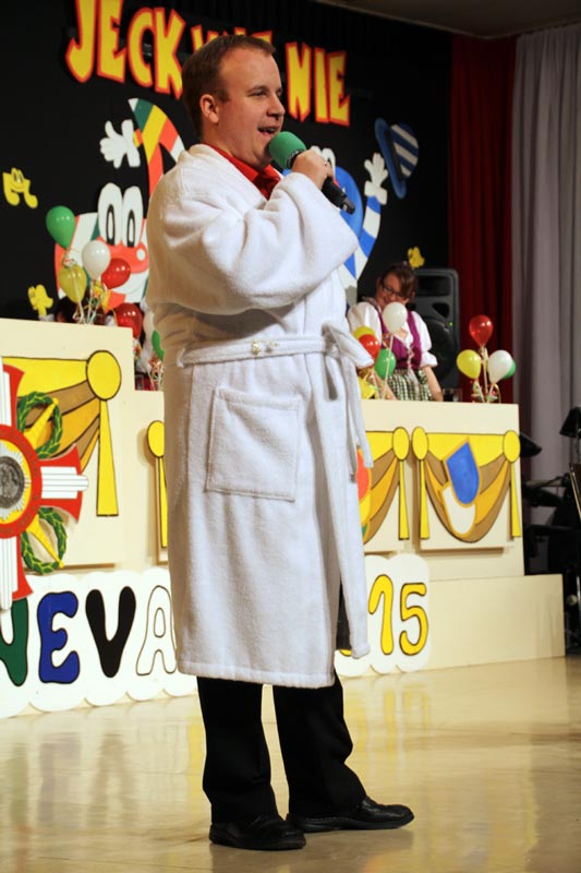 Pünktlich um 15 Uhr heizte der Literat schon einmal ein wenig den Saal auf. Mit seinem Sessionsschlager „Die Welt d´r Melodie“ empfing er den Elferrat mit unserem Präsidenten Detlev Michelsen.