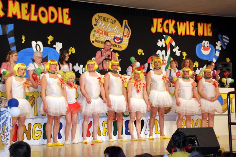 Nun herrschte wieder Ruhe im Saal, denn „Manni & Co.“ kamen auf die Bühne. Michael Hüsch und Verena Rausch wissen, wie Sie die Mädels in ihren Bann ziehen. Es blieb kaum ein Auge trocken. Aus dem Sitzungsprogramm nicht mehr weg zu denken ist auch die Gesangsgruppe „Krumm&Schief“, die auf der Bühne mit dem Hit „Das jeiht nie vorbei“ wieder eine tolle Gesangsnummer darbot.
